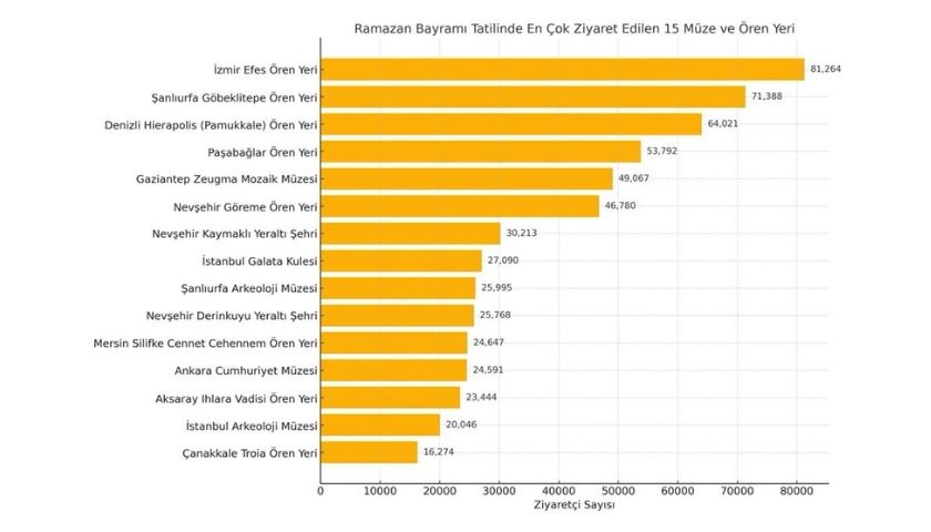Kültür ve Turizm Bakanlığının verilerine göre, 29 Mart – 6 Nisan tarihlerini kapsayan Ramazan Bayramı tatili süresince İzmir Efes Ören Yeri 81 bin 264 kişiyle en fazla ziyaret edilen nokta oldu. Onu 71 bin 388 ziyaretçiyle Göbeklitepe, 64 bin 21 ziyaretçiyle Hierapolis (Pamukkale) Ören Yeri takip etti.