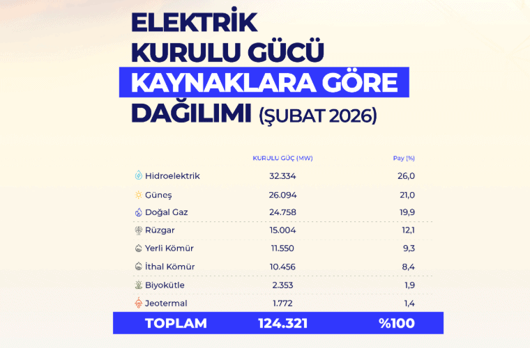 Şubat sonu itibarıyla toplam kurulu gücün yüzde 62,4’ü yenilenebilir kaynaklardan sağlanıyor. 77.556 megavatlık bu kapasite, Türkiye’nin temiz enerjiye verdiği önemin bir göstergesi oldu.